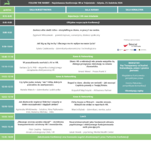 Co nas czeka na tegorocznym Króliku? Na tej stronie stopniowo będziemy publikować sylwetki tegorocznych prelegentów. Przygotowałyśmy dla Państwa 10 bardzo interesujących wystąpień. Jak co roku, tematyka będzie zróżnicowana. Nie zabraknie AI, który jest dziś na językach każdej branży. Pojawi się także temat jawności wynagrodzeń, o którym wiele mówimy w obszarze HR.